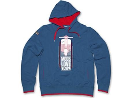 Dessuadora per a home en cotó amb caputxa i cangur. Imatge Vespa en el pit. Punys i cintura elàstics. Logotip Vespa sobre etiqueta metàl·lica en espatlla dreta.