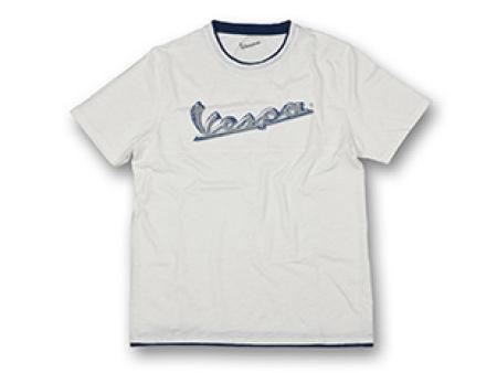 Camiseta hombre de algodón slub con logotipo Vespa en relieve. Logotipo Vespa sobre etiqueta metálica en manga derecha. Logotipo Vespa interno personalizado. Colores: blanco, gris y azul.
