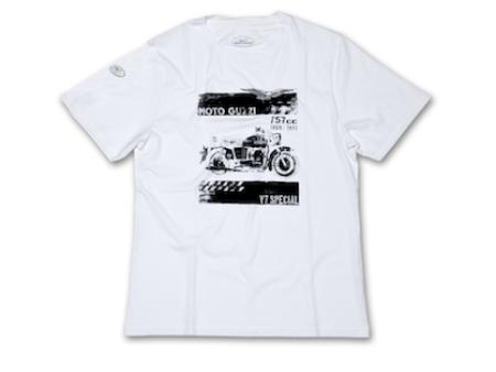 Camiseta hombre de algodón con efecto lavado a la piedra. Costuras en contraste en cuello, manga y parte inferior. Logotipo Moto Guzzi sobre etiqueta metálica en manga derecha. Imagen Vintage Moto Guzzi V7 Special.