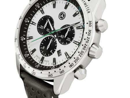 Cronógrafo «Heritage», caballero. Caja de acero inoxidable. Índices superpuestos y manillas negras fosforescentes. Detalles en verde Petronas. Escala de velocímetro en el bisel. Anillo giratorio interior con contador de 60 minutos. Cristal mineral templado. Correa de piel de becerro color negro perforada. Función de cronómetro. Sumergible hasta 10 ATM. Diámetro: 45 mm. Mecanismo de cuarzo Ronda 5030. Swiss made.